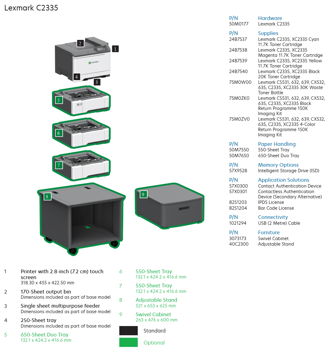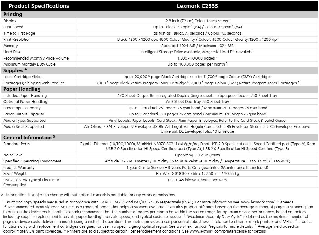 With exceptional performance and secure design, the C2335 printer delivers enhanced productivity, up to 35/33 ppm on letter/A4 paper and toner yields up to 20,000 pages mono, and up to 11,700 pages colour. Engineered for long life with environmental certifications and advanced power management, this efficient model offers many sustainability benefits. Fast time to first print, superior print quality and easy–to-use touch screen.
